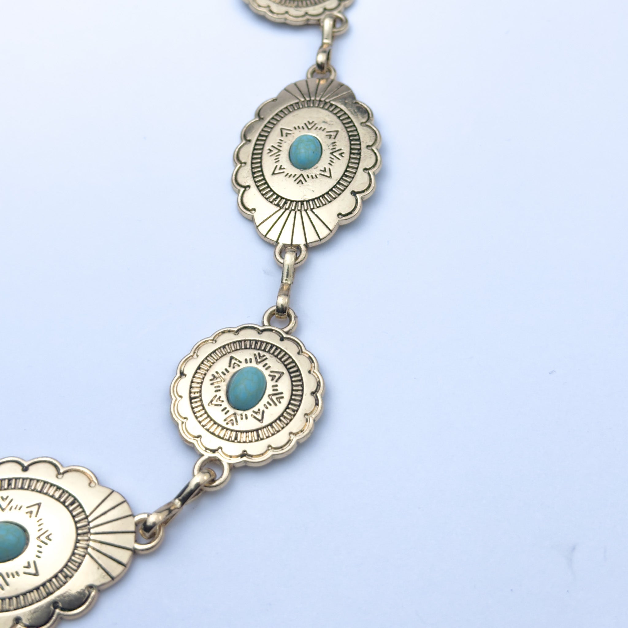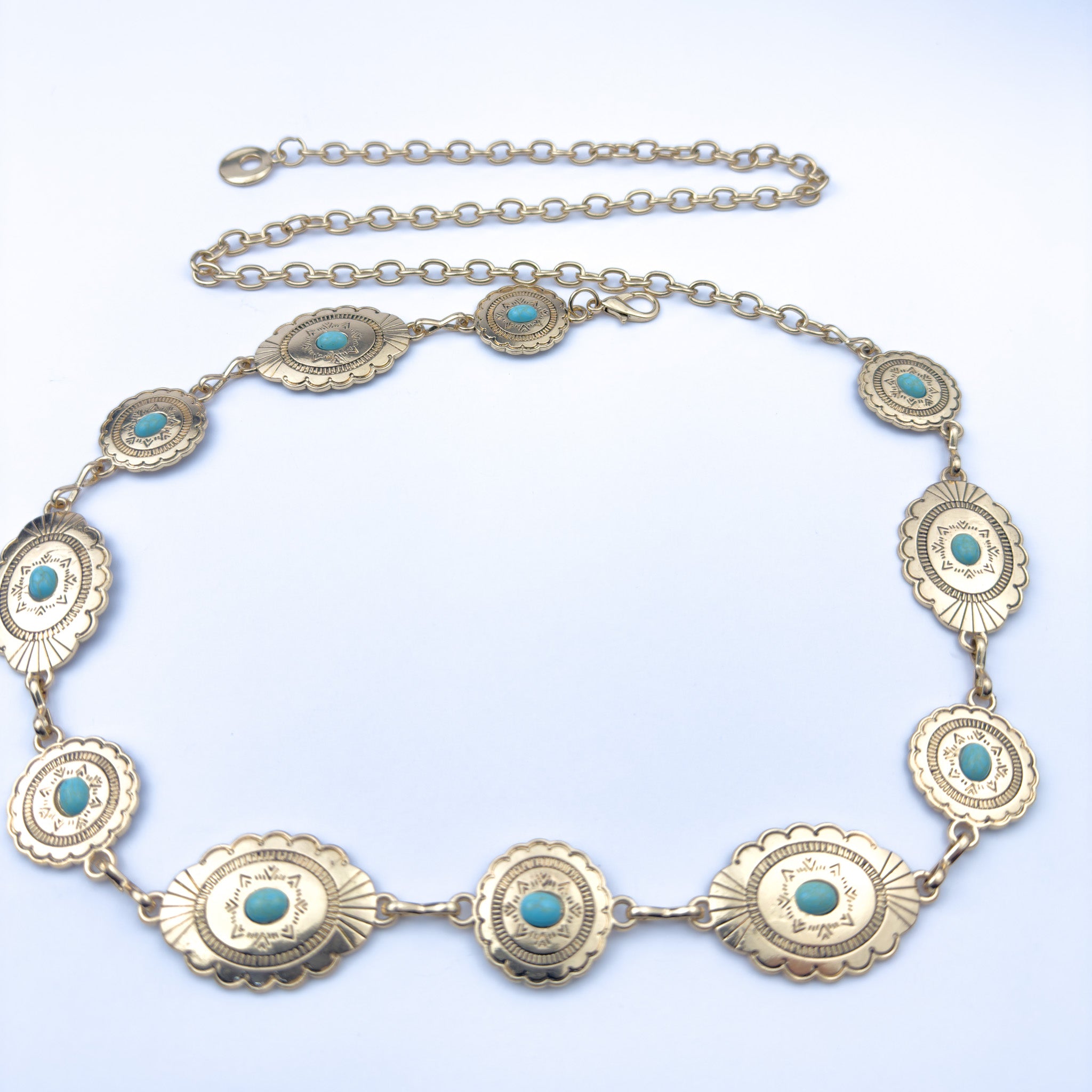مزيج مذهل من الذهبي والفيروز — حزام سلسلة بـميداليات بيضاوية بنقشات مستوحاة من الطراز الغربي، كل واحدة فيها حجر فيروز نابض بالحياة في المنتصف. جريء، ملفت، ومليان شخصية.