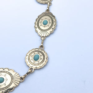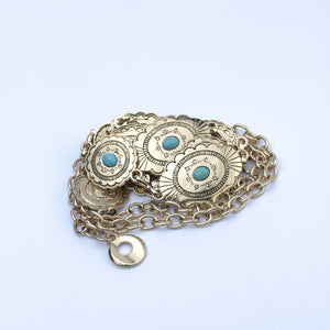 A stunning fusion of gold and turquoise — this chain belt features oval concho medallions with Southwestern-inspired engravings, each set with a vibrant turquoise stone at the centre. Bold, eye-catching, and full of personality.