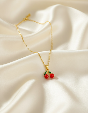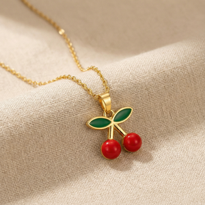 Featuring two glossy red cherries and green enamel leaves, this pendant adds a fresh, youthful touch to any outfit — perfect for girls who love cute, expressive jewellery.