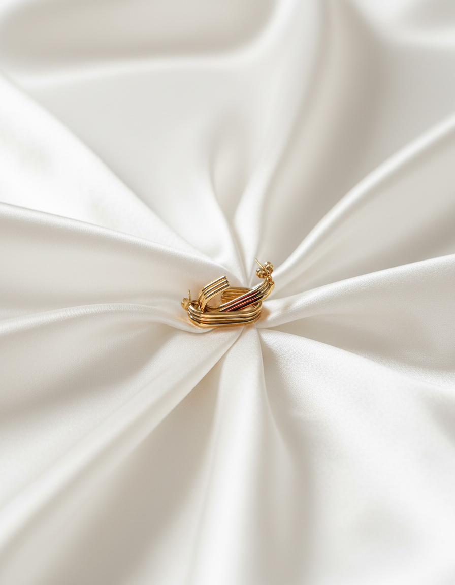 The smooth gold curves overlap elegantly, giving the illusion of stacked hoops in one refined piece. Designed to frame the face beautifully, these earrings strike the perfect balance between statement style and everyday wearability.
