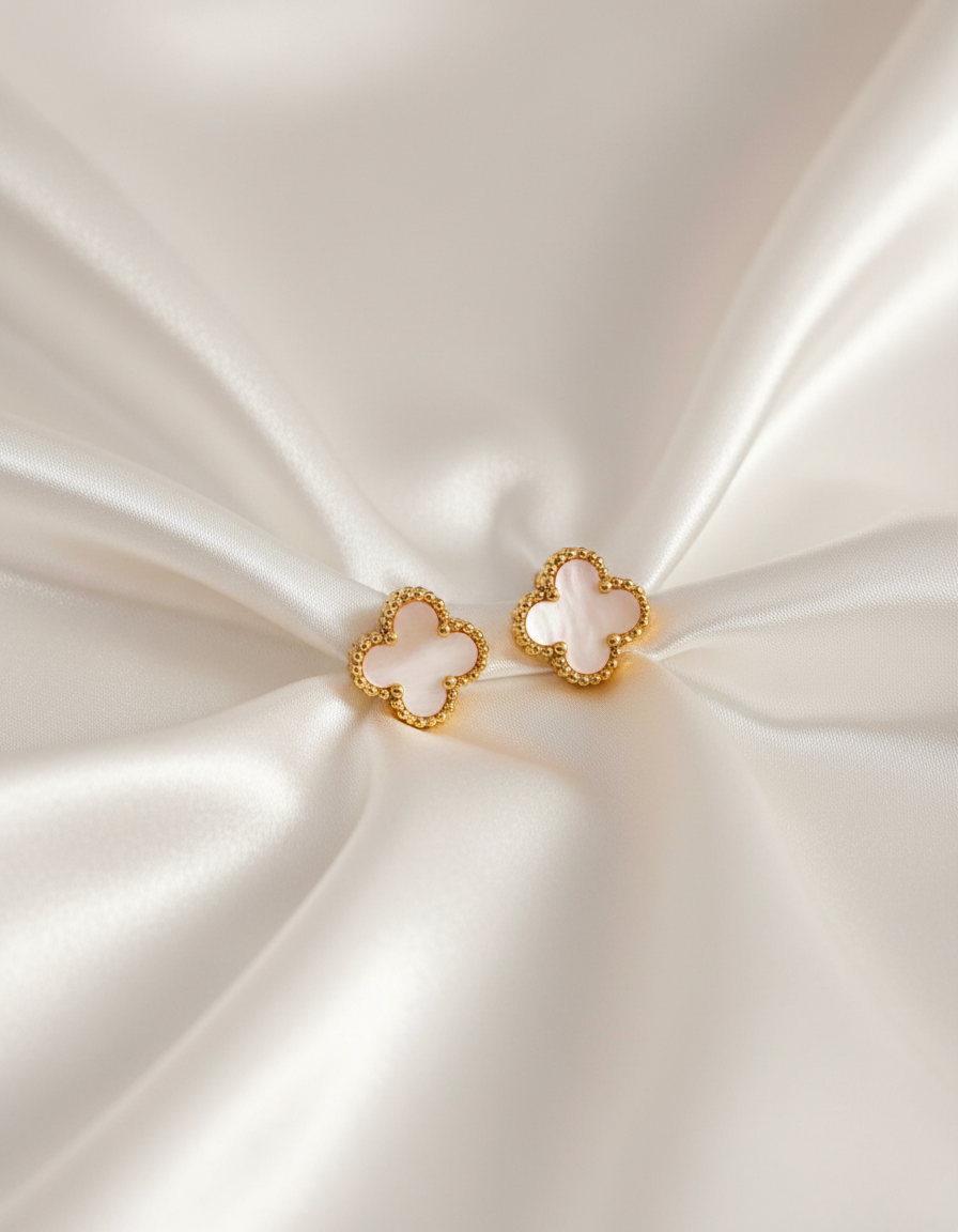 These White Clover Stud Earrings feature a delicate four-leaf floral shape crafted with a luminous mother-of-pearl center, framed by a polished gold beaded edge.